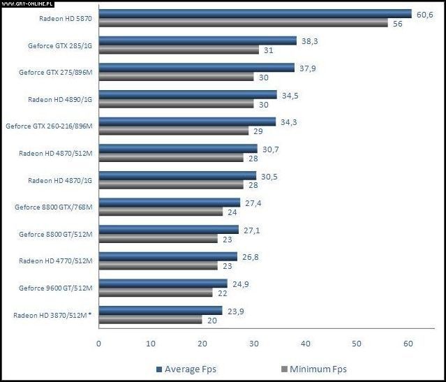 W teście przeprowadzonym przez redakcję PC Hardware sprawdzono 12 najpopularniejszych obecnie na rynku kart graficznych, łącznie z najnowszym Radeonem HD 5870. Do testów użyto również dość wymagającej scenerii – burza z piorunami, zamglony, pełen poruszającej się na wietrze roślinności teren i niesiona w dłoni głównego bohatera pochodnia, zapewniająca dynamicznie zmieniające się oświetlenie. Filmik prezentujący dokładnie lokację, w której testowane były karty znajdziecie w serwisie YouTube.