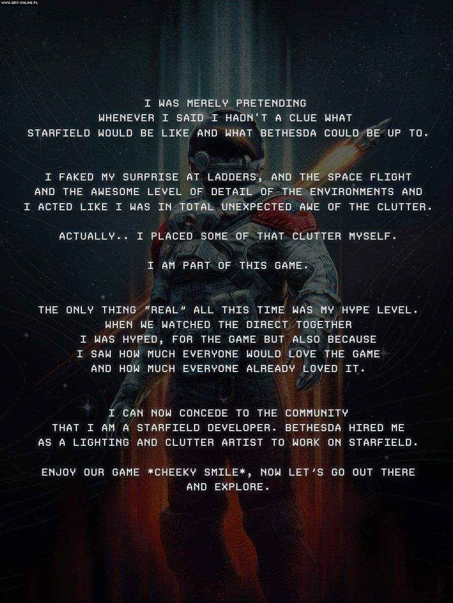 Jest to Emmi „Elianora” Junkarri – jej poprzednie prace znajdziecie w serwisie NexusMods.com. Jeśli zaś chodzi o Starfielda, Junkarri pracowała przy nim od października 2021 roku. Co więcej, wyjawiła społeczności na Twitterze/X, że przez długi czas udawała, że nie ma pojęcia, jaki będzie Starfield.
