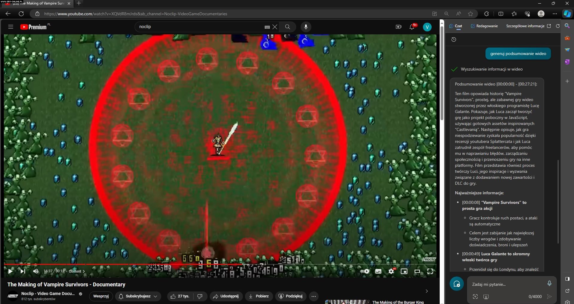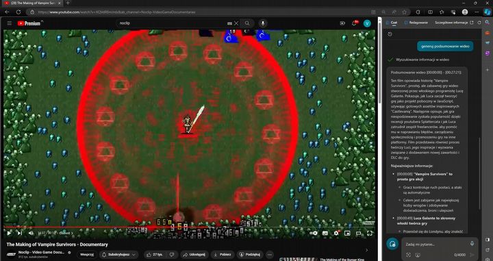 Takie podsumowanie możemy wygenerować, otwierając film na karcie, a następnie wpisując polecenie „generuj podsumowanie wideo”. Nim Copilot zacznie tworzyć dla nas streszczenie wybranego przez nas filmu, niezbędne jest zezwolenie firmie Microsoft na dostęp do zawartości odwiedzanych przez nas stron.