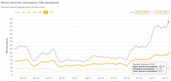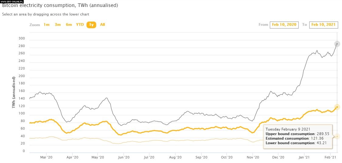 Takie dane podają uczeni z Uniwersytetu Cambridge. Obecne zużycie energii przekroczyło 121 TWh na rok, czyli jest to poziom np. Holandii czy Norwegii (Polska w 2020 roku zużyła ok. 170 TWh – źródło). Przy czym nie są to faktyczne dane, ale raczej rodzaj symulacji. Podanie realnego zużycia nie jest na razie możliwe. Model używany przez CBECI (Cambridge Bitcoin Electricity Consumption Index) bazuje na danych sprzętu używanego w wykopywaniu Bitcoina (moc kart graficznych i koparek).