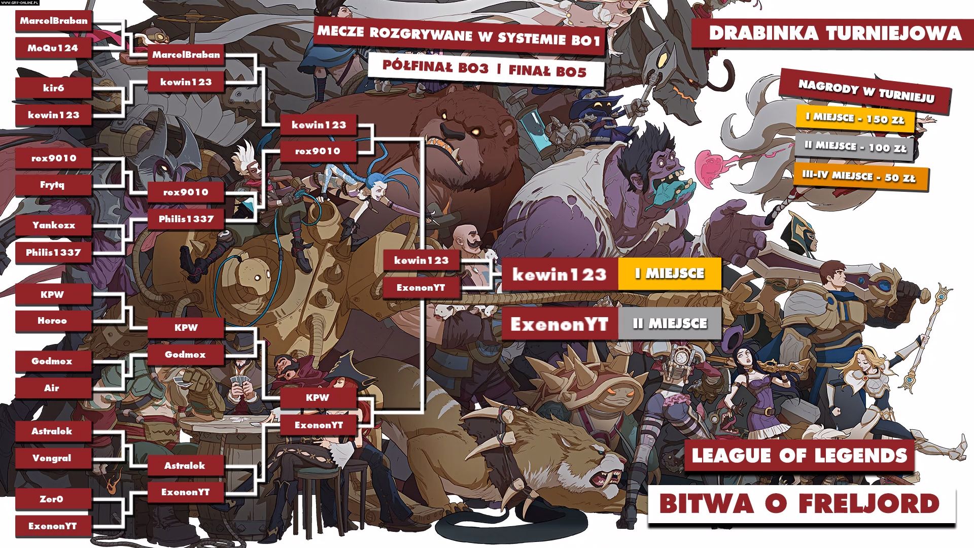 Finałowy pojedynek przez większość czasu był dość spokojny i wydawało się, że o zwycięstwie zadecyduje liczba last hitów. Tak się jednak nie stało. Po 6 minutach last hitowania Caitlyn ExenonaYT popełniła ogromny błąd wychodząc zbyt mocno do przodu. Kevin znakomicie to wykorzystał, idealnie stawiają klatkę Yoricka i uniemożliwiając policjantce z Pilotover jakąkolwiek ucieczkę. Walka na bliski dystans zakończyła się zwycięstwem umarlaka, a tym samym kewin123 został zwycięzcą pierwszej Bitwy o Freljord!