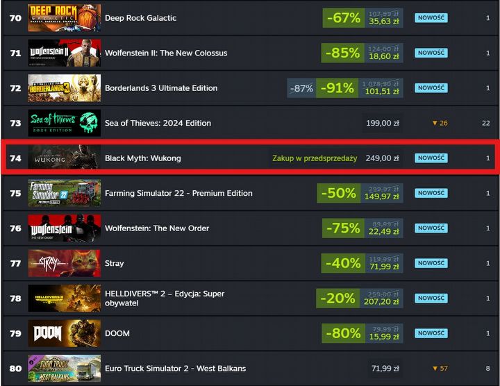 Black Myth: Wukong to wyczekiwana przez wielu produkcja, którą od 7 czerwca zamówić można w ramach przedsprzedaży. Jak widać, znaczące grono graczy zdecydowało się nie czekać z zakupem do premiery, co przełożyło się na topową pozycję na liście bestsellerów. Black Myth: Wukong króluje w globalnym rankingu, aczkolwiek nie znajduje to odzwierciedlenia w Polsce. Na naszym podwórku tytuł znajduje się daleko poza pierwszą pięćdziesiątką.