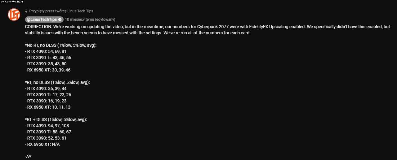 Przykład komentarza zawierającego poprawki do materiału na kanale Linus Tech Tips.Źródło: YouTube | Gamers Nexus.