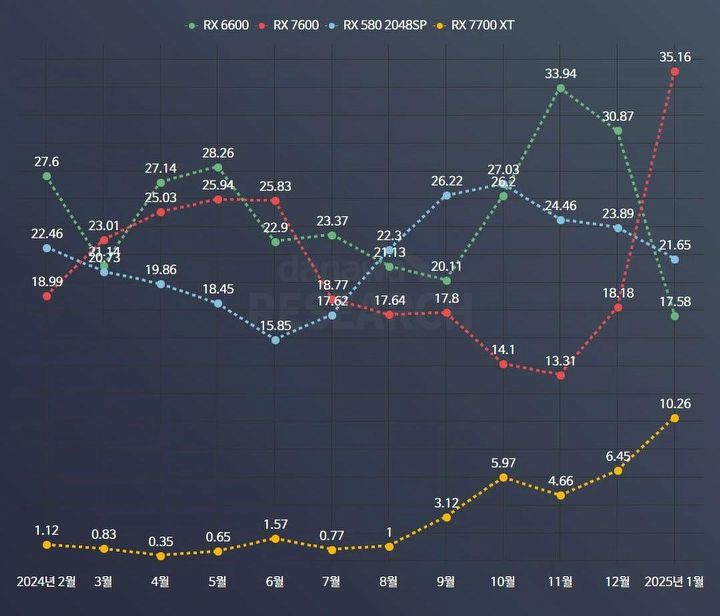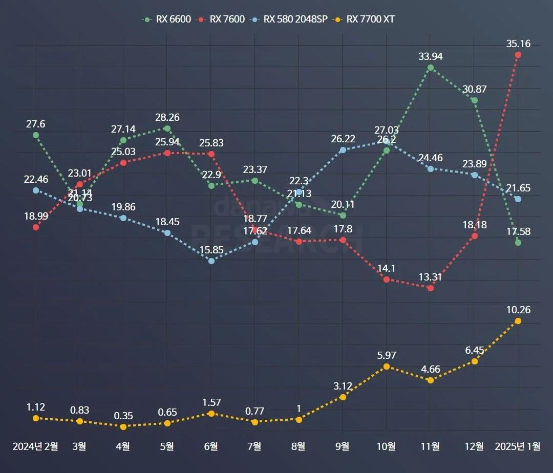 Udział [%] poszczególnych modeli GPU Radeon na południowokoreańskim rynku (luty 2024 – styczeń 2025).Danawa.com / vide: Wccftech