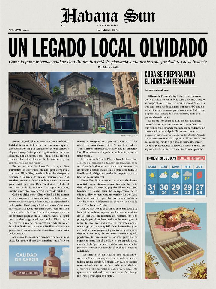 Znajdują się na niej dwa artykuły. Pierwszy opowiada historię rodziny Diazów. Założyli oni na Kubie niewielką destylarnię rumu i stworzyli markę Don Rumbotico, która z czasem zyskała sporą popularność. Zwróciło to uwagę potężnej megakorporacji, która złożyła propozycję kupna firmy. Diazowie początkowo odmówili, co doprowadziło do serii dziwnych wypadków, z pożarem destylarni na czele. W konsekwencji rodzina została zmuszona do sprzedaży interesu za ułamek wartości. To samo spotkało jedną z lokalnych atrakcji turystycznych - The Havana Sea Fort. Budynek został całkowicie zamknięty dla zwiedzających i pojawili się wokół niego ochroniarze, zatem trudno powiedzieć, co takiego konsorcjum tam szykuje.