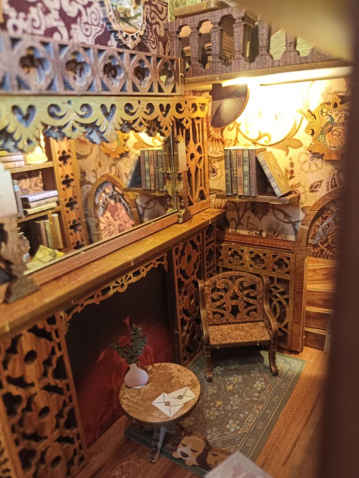 Na niewielkiej przestrzeni 11x18x23cm upchnięto też drewnianego pieska, lustro, kominek, kwiatki czy zasilane bateriami oświetlenie – przywiązanie do detali to kosmos. I efekt końcowy to też kosmos – ale myślę, że zdjęcia mówią tutaj więcej niż słowa. Drugi z zestawów jeszcze nie został zbudowany, natomiast Eternal Bookstore dumnie ozdabia naszą półkę z ksiązkami.