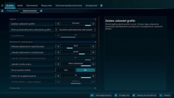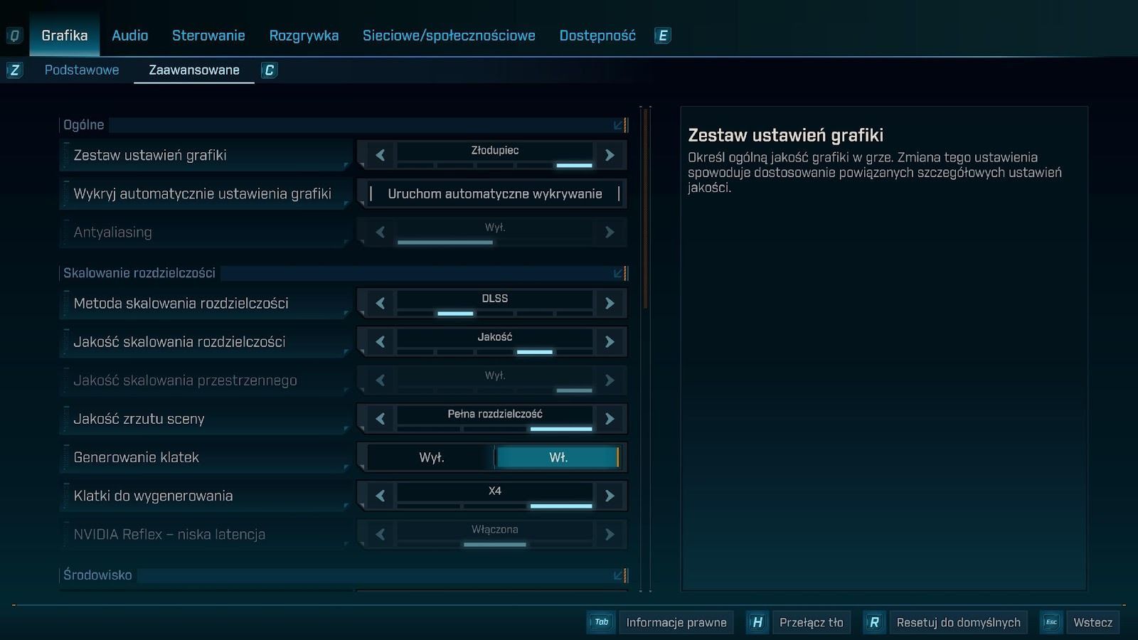 Aby aktywować DLSS w Borderlands 4, należy w menu przejść do zakładki „Grafika”, a następnie do kolumny „Zaawansowane”. Tam trzeba poszukać opcji „Skalowanie rozdzielczości”. By uzyskać Multi Frame Generation, wybierzcie x2, x3 lub x4 w oknie „Klatki do wygenerowania”. Przy uruchomionym DLSS i generowaniu klatek technologia NVIDIA Reflex jest włączona automatycznie, więc nie musicie nic robić.