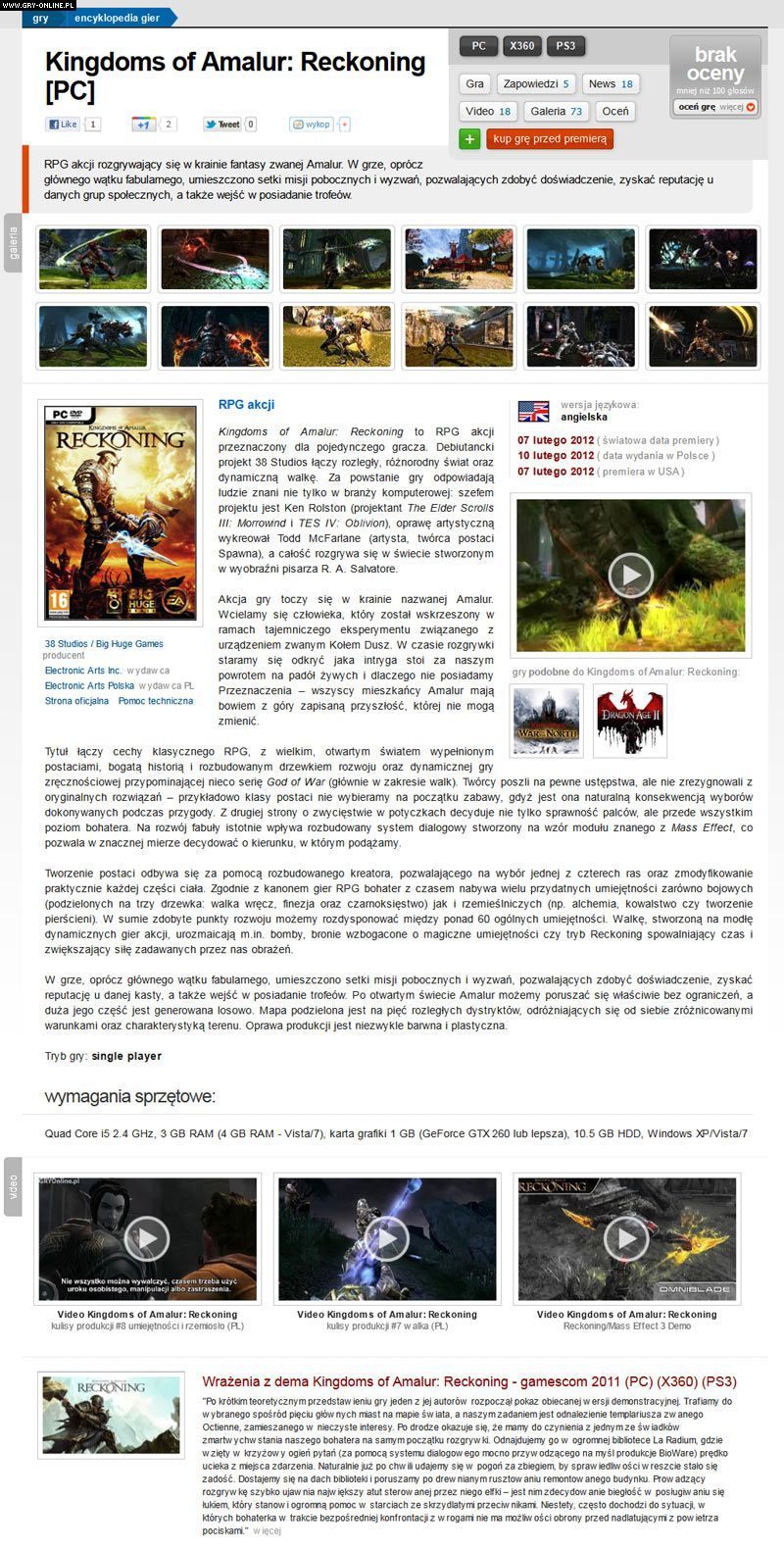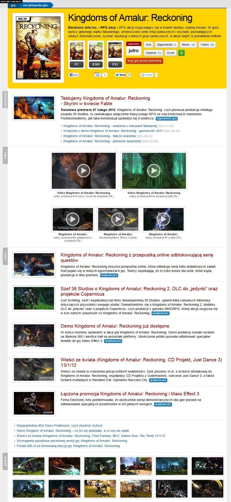 Powyższa strona nie istnieje w obecnej wersji serwisu. Jest to miejsce, gdzie agregujemy wszelkie materiały opublikowane do danej gry, bez względu na jej platformę sprzętową. W wewnętrznej terminologii nazywamy ją stroną grupy - w naszym przykładnie widzimy jedną grupę gier, na którą składają się wszystkie edycje sprzętowe gry Kingdoms of Amalur: Reckoning.