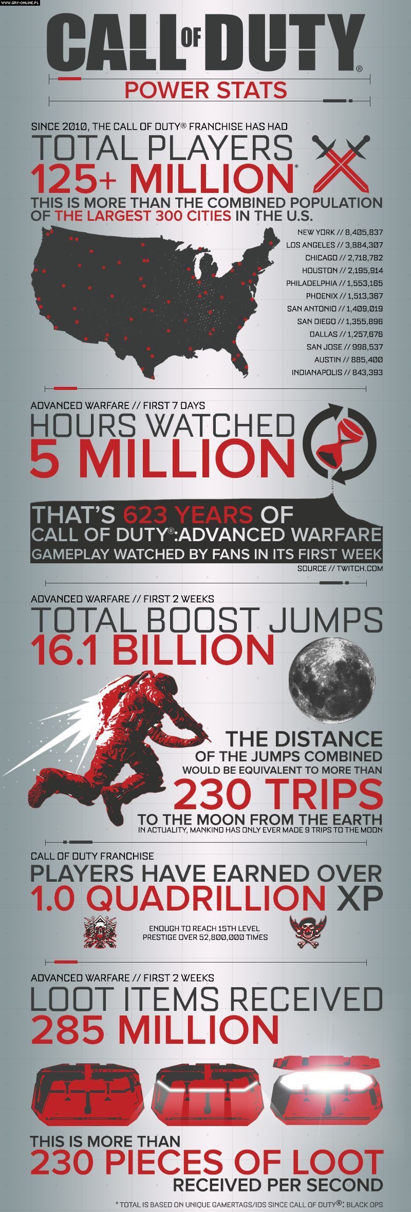 Firma Activision opublikowała ciekawą infografikę, dzięki której poznaliśmy szereg interesujących statystyk związanych z serią Call of Duty, a zwłaszcza z najnowszą odsłoną cyklu – wydanym na początku tego miesiąca Call of Duty: Advanced Warfare.