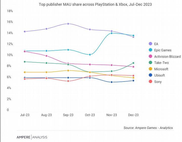 Niemniej słabnący wynik AB może dziwić. Analitycy Ampere wskazują jako przyczynę słabnącą popularność Diablo IV: w grudniu gracze spędzili w Sanktuarium średnio 10 godzin mniej niż w poprzednim miesiącu. Być może jest to również efekt chłodnego przyjęcia Modern Warfare 3, aczkolwiek autorzy raportu twierdzą, że seria Call of Duty poradziła sobie „względnie” dobrze w okresie świątecznym.