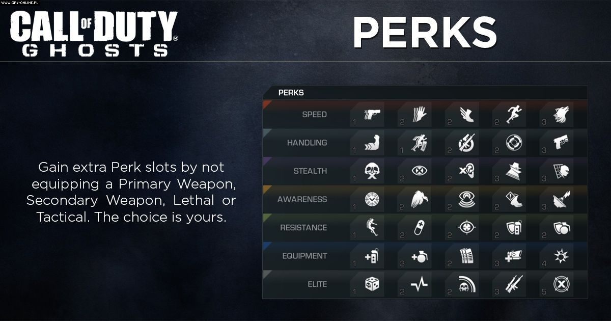 Jednym z istotnych elementów trybu multiplayer w Call of Duty: Ghosts będzie system perków, umożliwiający dostosowanie umiejętności postaci do własnych preferencji. Już wcześniej dowiedzieliśmy się sporo na jego temat, lecz twórcy nie poprzestali na tym i podzielili się nowymi informacjami.