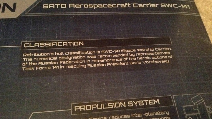 Jak wynika z zawartych na plakacie informacji, nazwa kadłuba statku Retribution, stanowiącego swego rodzaju bazę wypadową w Call of Duty: Infinite Warfare, to SWC-141. Oznaczenie to zarekomendowała Federacja Rosyjska, by uczcić pamięć heroicznych akcji żołnierzy z jednostki Task Force 141, którym udało się odbić prezydenta Borysa Worszewskiego z rąk terrorystów i zakończyć wojnę, jaka rozpętała się pomiędzy Rosją a Stanami Zjednoczonymi. Wydarzenia te z pewnością pamiętają fani serii, którym nieobca jest jej trzecia odsłona i opowiedziane w niej wydarzenia.