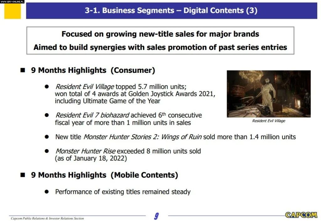 Dane opublikowane w raporcie uwzględniają okres między 1 kwietnia a 31 grudnia 2021 roku. W tym czasie Capcom sprzedał łącznie 25,8 miliona kopii swoich gier. Stanowi to wzrost o 30% w stosunku do poprzedniego roku.