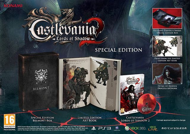 Jeśli chodzi o zawartość Castlevania: Lords of Shadow 2: Special Edition, to w środku znajdziemy, prócz płyty z grą, album z grafikami koncepcyjnymi, w którym zostaną zawarte szczegóły na temat artworka prezentującego postać Drakuli, oraz unikatowe pudełko z odnotowanym napisem Belmont (nazwisko bohatera gry) na okładce. Wydanie nie zawiera żadnych cyfrowych dodatków, a największą, a właściwie jedyną atrakcją dla miłośników tej podserii jest kolorowy artbook w twardej oprawie. Niestety, nie wiemy, ilu stronicowy.