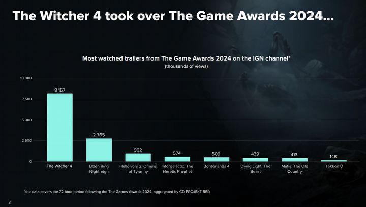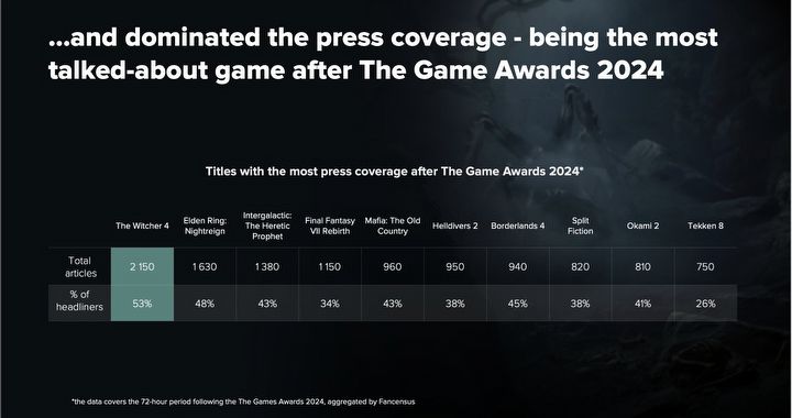 Co ciekawe – wspomniany trailer należał też do najlepiej oglądających się spośród wszystkich zaprezentowanych na zeszłorocznym TGA (na kanale IGN ma on już prawie 10 milionów wyświetleń). Ostatecznie nowy Wiedźmin zdominował też pozostałe tytuły zaprezentowane na gali pod kątem częstotliwości występowania na łamach branżowych serwisów informacyjnych – był grą, o której „najwięcej się mówiło”.