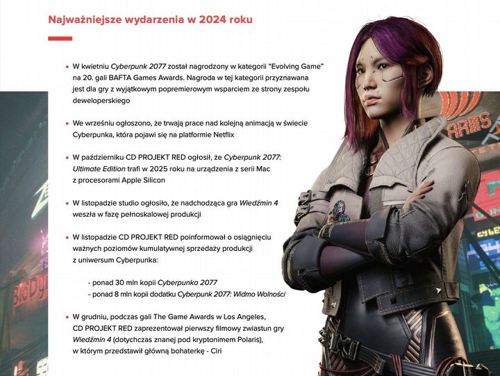 Duży wpływ na wyniki Grupy CD Projekt miał Cyberpunk 2077. W listopadzie 2024 roku sprzedaż gry przekroczyła 30 milionów egzemplarzy, a dodatek Widmo Wolności rozszedł się w ponad 8 milionach kopii. Wysoką jakość wsparcia popremierowego doceniła też branża – Cyberpunk 2077 zdobył nagrodę BAFTA w kategorii Best Evolving Game.