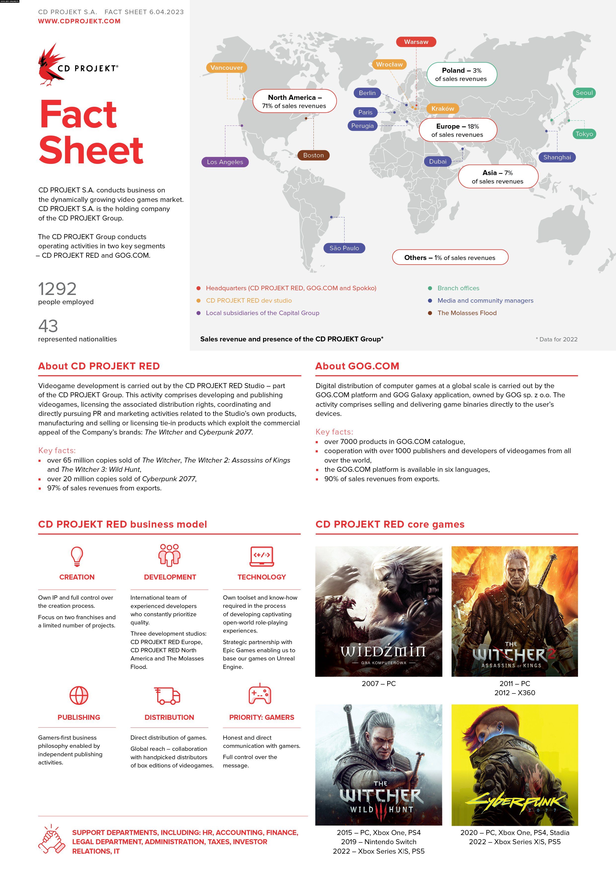 Grupa CD Projekt udostępniła dziś nową wersję broszury zawierającej szereg interesujących faktów o firmie i jej biznesowych operacjach. Z opublikowanych infografik (zobaczycie je poniżej) poznaliśmy odpowiedzi m.in. na pytania o to, ile osób pracuje w CDP czy jak rozkładają się przychody spółki na poszczególne części świata.