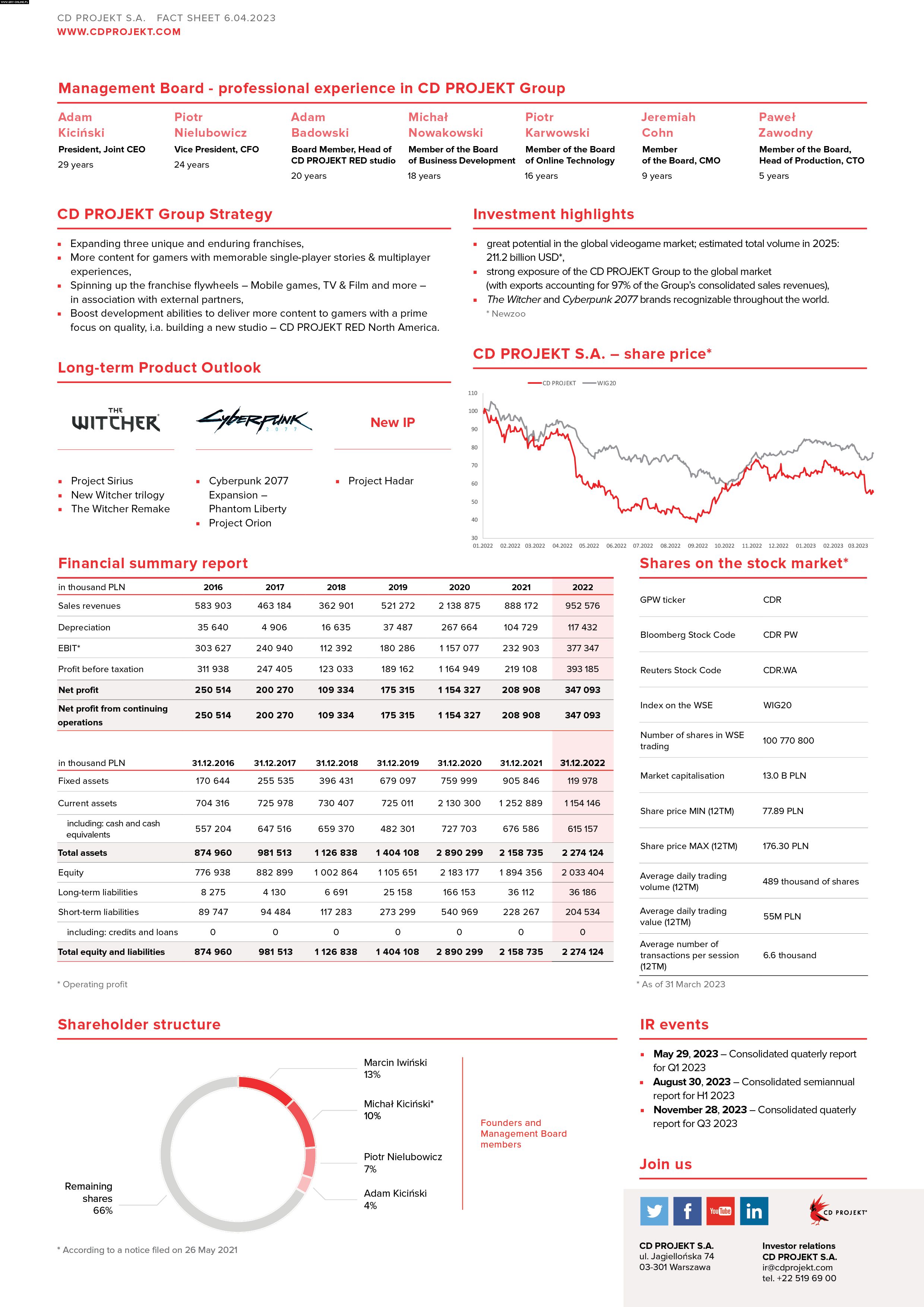 Wiemy także, kiedy możemy spodziewać się kolejnych sprawozdań finansowych CD Projektu. Dane za pierwszy kwartał tego roku pojawią się 29 maja; półroczne sprawozdanie poznamy 30 sierpnia, a wyniki z trzeciego kwartału zostaną opublikowane 29 listopada.