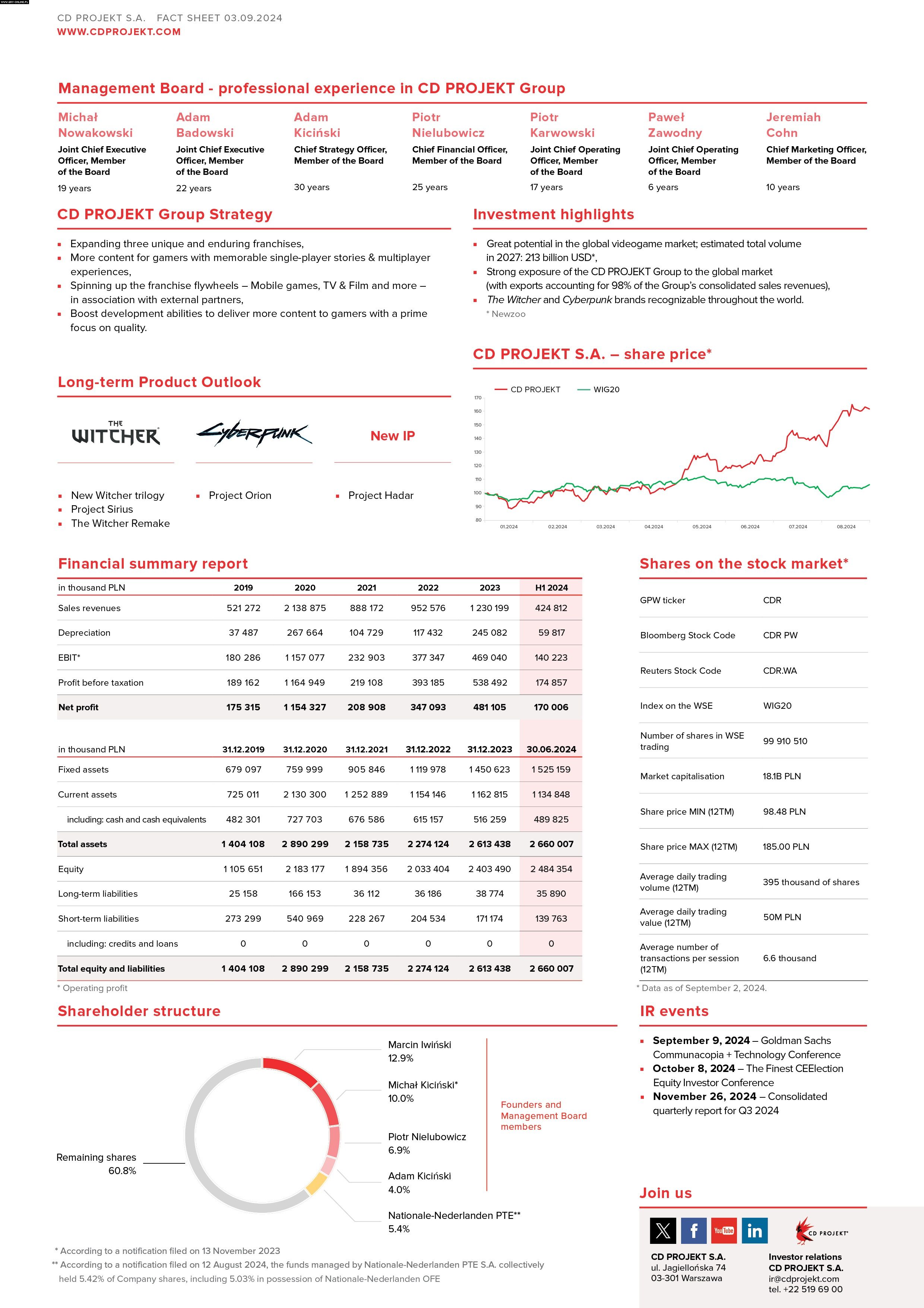 Warto również zwrócić uwagę na obecną cenę akcji CDP. Na grafice przedstawiono, że wynosi ona ok. 160 zł, lecz 30 sierpnia osiągnęła 184,85 zł, a dziś, ok. godz. 17:00, uplasowała się na poziomie 176,35 zł. Tak wysoko akcje polskiej firmy nie stały od stycznia 2022 r., kiedy to sięgnęły maksymalnie 204 zł. Wprawdzie do rekordowej stawki z sierpnia 2020 r., wynoszącej 460,80 zł, wciąż jest bardzo daleko, ale dobre wyniki finansowe i fakt, że Wiedźmin 4 powoli wkracza w etap pełnej produkcji, a sequel Cyberpunka 2077 w fazę preprodukcji sprawia, iż niebawem wartość akcji firmy może się zbliżyć do tej wartości.
