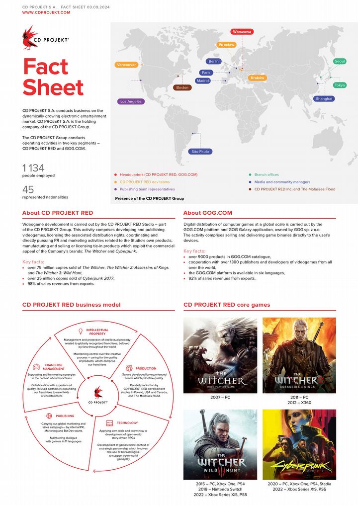 Firma CD Projekt opublikowała dziś w serwisie X dwie grafiki prezentujące garść faktów na swój temat. Przedstawione na nich dane w większości nie są nowe – np. o sprzedaży Cyberpunka 2077 (25 mln kopii) i gier z serii Wiedźmin (75 mln kopii) wiemy od października 2023 r., a o 9000 gier dostępnych na GOG-u przedsiębiorstwo informowało w ostatnim raporcie finansowym. Zebrane w jedną całość dobrze jednak pokazują, jak bardzo polska firma urosła na przestrzeni lat i jak istotnym graczem w branży się stała.