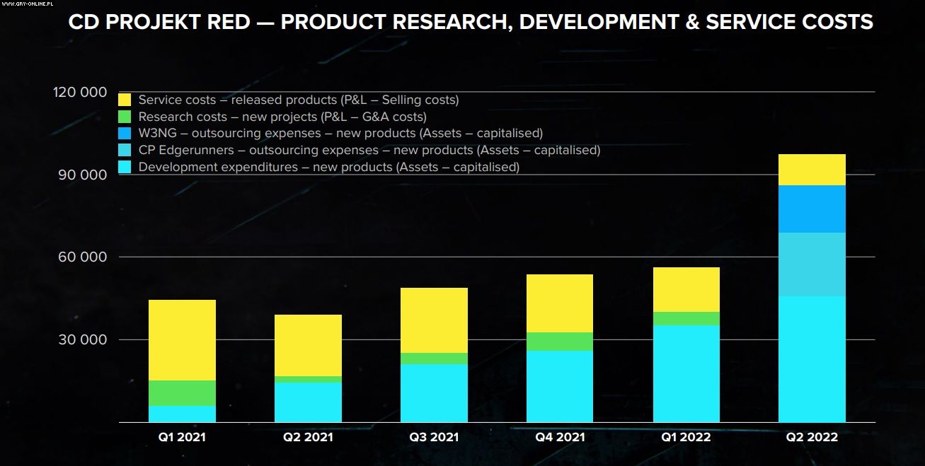 Wydatki CD Projektu wyraźnie wzrosły, choć na wykresie za drugi kwartał brakuje sekcji „Koszty badawcze – nowe projekty”.Źródło: Grupa CD Projekt