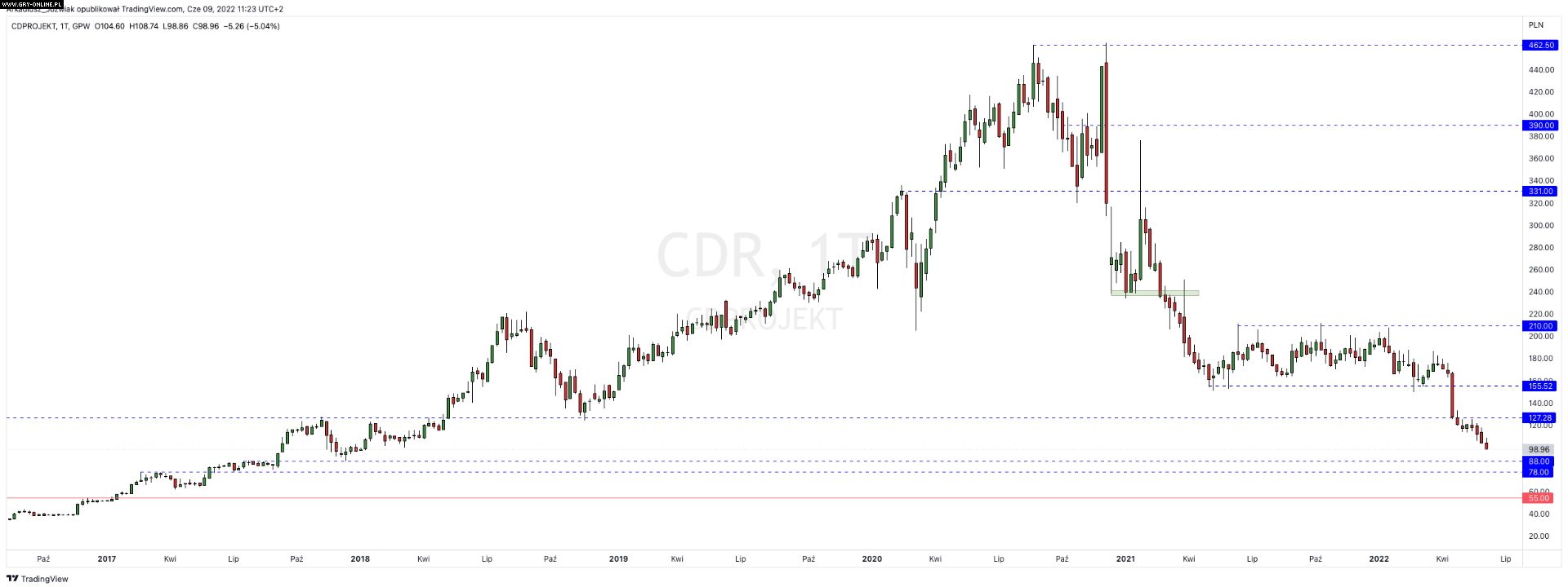 Źle się dzieje w CD Projekt. Notowania największego polskiego producenta gier mocno pikują na giełdowych wykresach. Kurs akcji twórców Wiedźmina i Cyberpunka 2077 spada trzecią sesję z rzędu, przebijając barierę 100 zł, co jest najniższym poziomem od stycznia 2018 roku.
