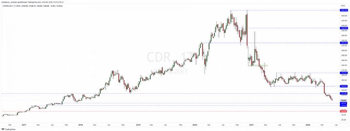 Jak podaje PAP, powołując się na agencję Bloomberg, widząc, co się aktualnie dzieje z polską spółką, analitycy Bank of America postanowili obniżyć cenę docelową akcji CD Projekt do zaledwie 55 zł. Jest to najniższy poziom od 2017 roku (czerwona linia na przedstawionym poniżej wykresie).