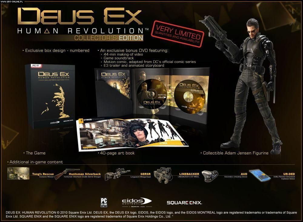 W skład zestawu wejdzie figurka Adama Jensena, liczący 40 stron artbook oraz dodatkowa płyta DVD ze sporą ilością materiałów. Wśród nich znajdziemy trwający 44 minuty film przedstawiający kulisy produkcji, półgodzinną ścieżkę dźwiękową, animowany komiks, zwiastun z targów E3 oraz animowany scenopis obrazkowy.
