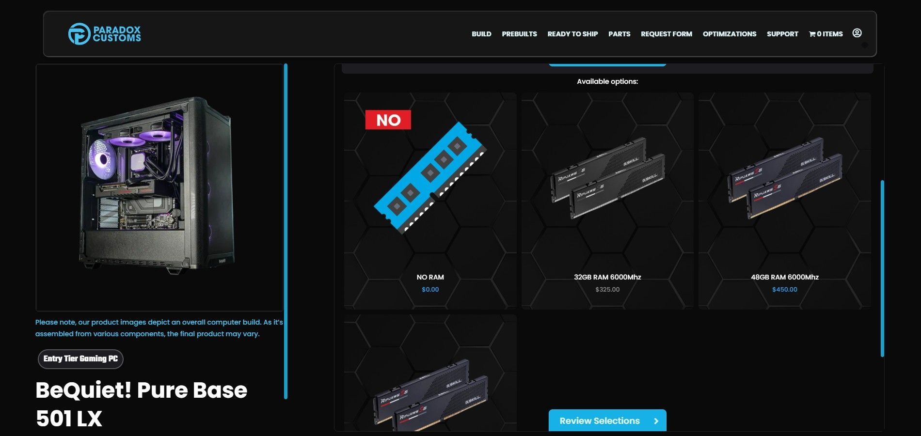 Firma Paradox Customs ogłosiła w swoich mediach społecznościowych, że od teraz dostępna jest dodatkowa opcja podczas konfiguracji komputera. W kategorii pamięci RAM, obok wariantów 32 GB, 48 GB i 64 GB, gracze mają do wyboru także czwarty: kompletny brak kości w zestawie. W teorii pozwala to zaoszczędzić kilkaset dolarów.