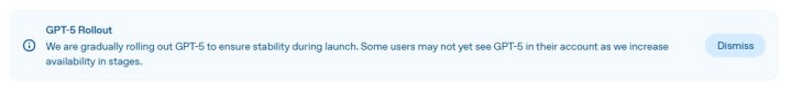 Stopniowo wypuszczamy GPT-5, żeby zapewnić stabilność podczas premiery. Część użytkowników jeszcze nie będzie widziała GPT-5 na swoich kontach, bo zwiększamy dostępność etapami.