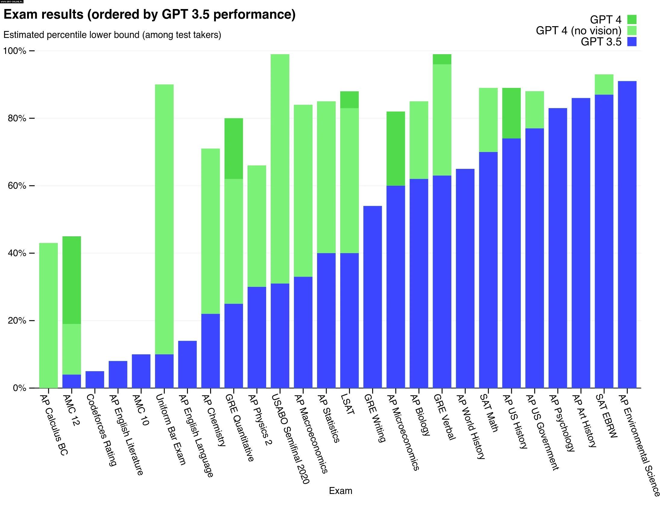 Nowa wersja to także ulepszenia w zakresie samego działania. Teraz korzystanie z ChatGPT ma być bezpieczniejsze. Dotyczy to prawdziwości podawanych przez AI odpowiedzi i jakości otrzymywanych treści. Te mają być teraz według obietnicy o 40% bardziej rzeczowe dzięki współpracy z ekspertami z dziedzin takich jak np. medycyna czy geopolityka. Nowy model językowy został już porównany z GPT-3.5 w skuteczności rozwiązywania testów odnoszących się do m.in. nauk ścisłych i powiązanych z językiem. Poniżej został umieszczony wykres, który pokazuje te różnice.