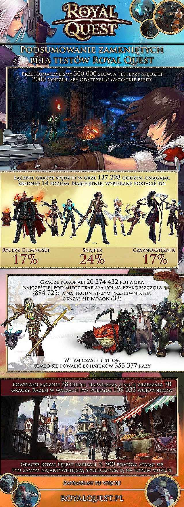 W minionym tygodniu firma Cenega ogłosiła, że polskojęzyczna wersja Royal Quest weszła w fazę otwartych beta-testów. Przedstawiciele wydawcy zdradzili, że gracze biorący udział w zamkniętych testach produkcji spędzili w jej świecie prawie 140 tysięcy godzin, zaś testerzy przez przeszło 2000 godzin sprawdzali poprawność wszystkich 300 tysięcy słów składających się na rodzimą lokalizację. Od tej pory wszyscy zainteresowani światem Aury mogą bez ograniczeń korzystać z jego dobrodziejstw, wystarczy zarejestrować się pod tym adresem. Poniżej prezentujemy infografikę przygotowaną przez przedstawicieli firmy Cenega, na której znajdziecie wszystkie najciekawsze fakty i liczby dotyczące polskiej edycji Royal Quest.