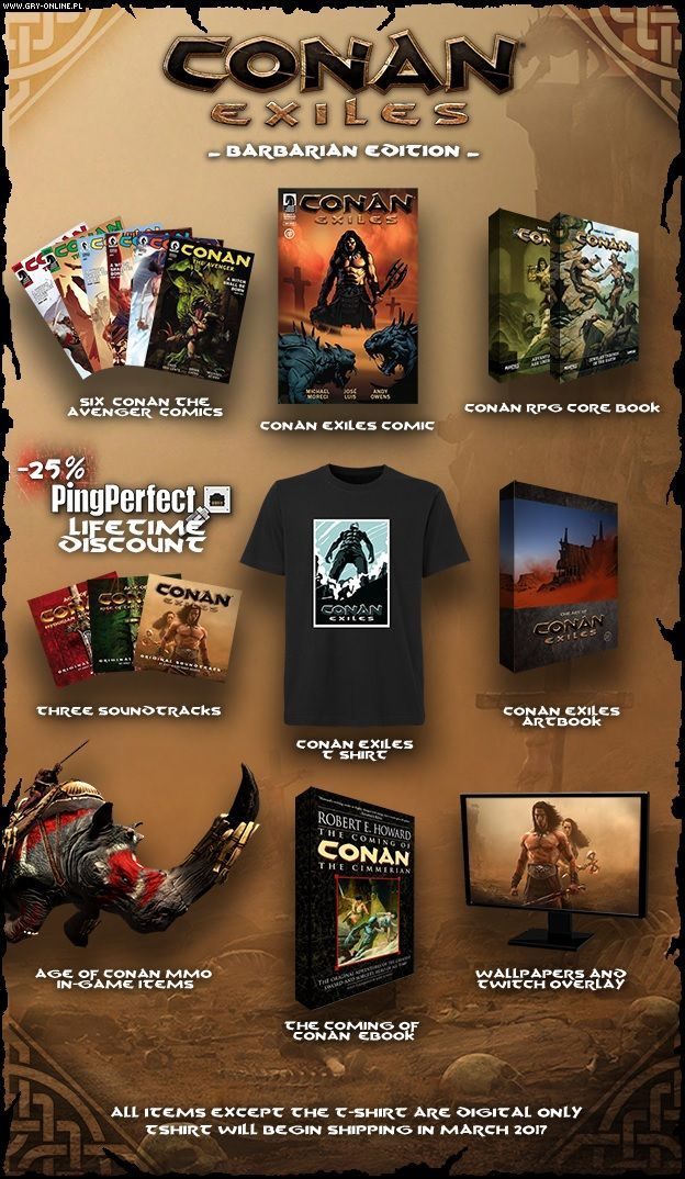 W ogłoszeniu twórców znalazła się też informacja na temat ceny wydania Steam, które ma kosztować 29,99 dolarów (ceny w euro nie podano). Oprócz standardowej wersji gracze będą mogli zakupić edycję specjalną o nazwie Barbarian Edition. Ta kosztować będzie dwukrotnie więcej (59,99 dolarów), ale zaoferuje sporo bonusów. W jej skład wejdą m.in. liczne cyfrowe komiksy z Conanem, koszulka z motywem z gry, ścieżka dźwiękowa z trzech dzieł Funcomu (Age of Conan: Hyborian Adventures wraz z dodatkiem Rise of the Godslayer oraz Conan Exiles) oraz album z grafikami koncepcyjnymi.