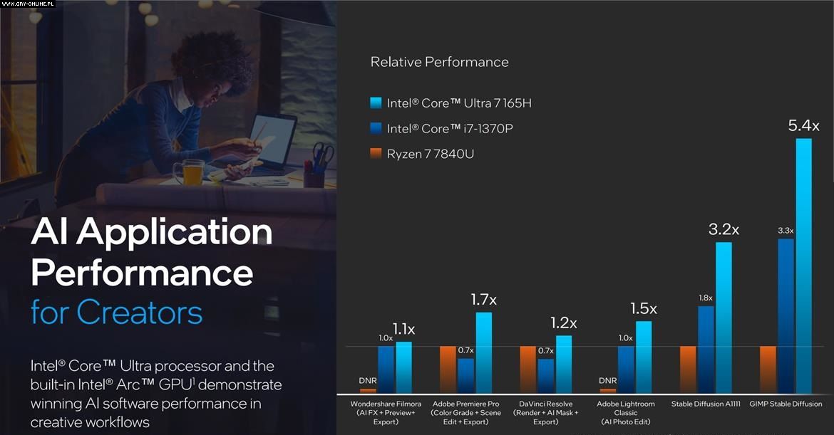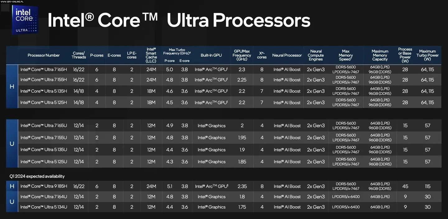 Firma podzieliła się również informacjami na temat wydajności nadchodzących układów. Zgodnie z zapewnieniami firmy Core Ultra 7 165H zapewnia o 11% większą wydajność w porównaniu z konkurencyjnym Ryzenem 7 7840U. Omawiany procesor ma również pokonywać układy Snapdragon 8cx Gen 3 i Apple M3. Warto jednak zaznaczyć, że niedawno „czerwoni” również zaprezentowali układy z serii Ryzen 8040. Dodatkowo układy Core Ultra z serii H mają otrzymać nowe układy graficzne Arc.