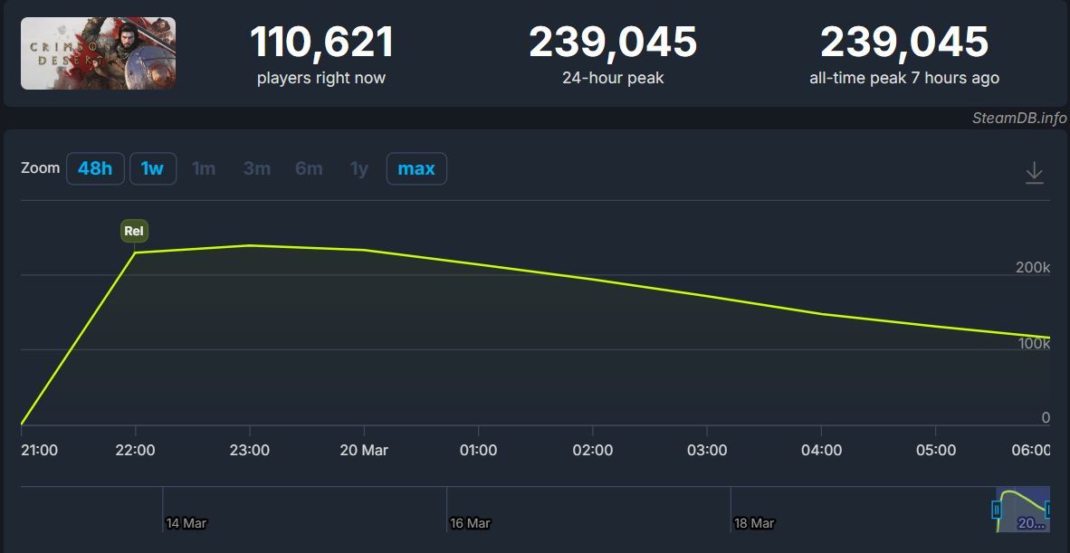 Trzeba jednak przyznać, że Crimson Desert wystartował solidnie, jeśli chodzi o liczbę grających, co nie powinno dziwić, biorąc pod uwagę przedpremierowy hype. Na samym Steamie w szczytowym momencie w grze bawiło się prawie 240 tysięcy osób, a w chwili pisania tego tekstu jest ich 110 tysięcy. Niewykluczone, że wynik będzie jeszcze lepszy w weekend.