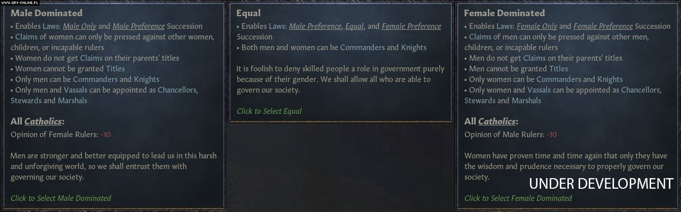 Tak więc na przykład będzie można ustawić równość płciową, dzięki której zarówno mężczyźni, jak i kobiety będą posiadały identyczne prawa (podobnie jak można to było zrobić w drugiej odsłonie cyklu), ale nic nie stoi na przeszkodzie, aby ustalić dominację tylko jednej z płci. Co więcej, małżonkowie władców podczas ich nieobecności w królestwie będą mogli zajmować się rozmaitymi sprawami, takimi jak negocjacje czy też rekrutowanie nowych jednostek.