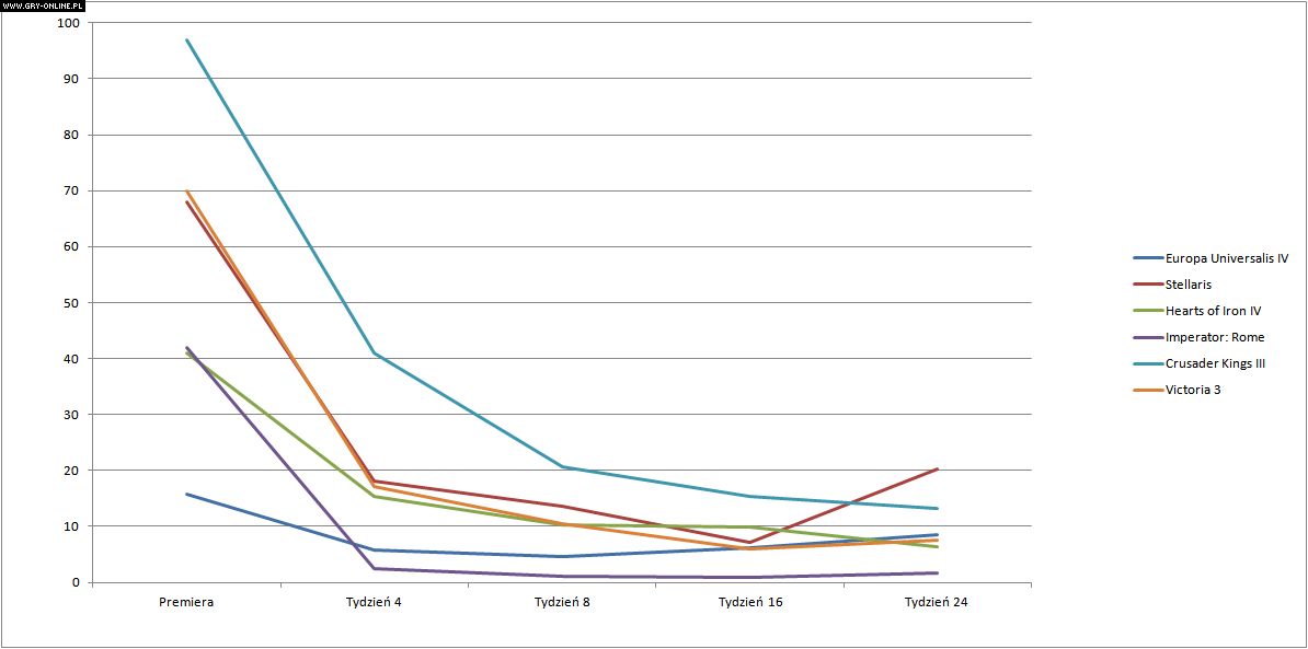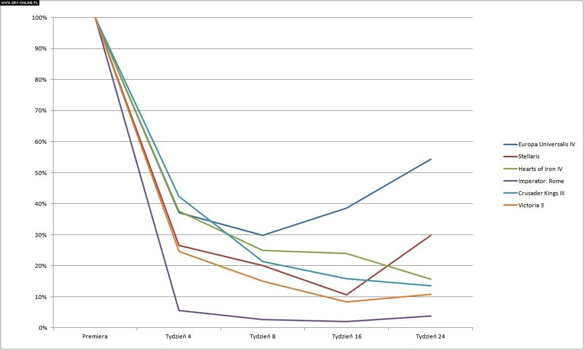 Skoro o EU4 mowa, w teorii to tytuł cieszący się najbardziej „stabilnym” zainteresowaniem tuż po wydaniu. Jednak dotyczy to tylko ujęcia procentowego: premiera czwartej odsłony serii Europa Universalis przyciągnęła znacznie mniej osób niż kolejne produkcje Paradoxu. W przeliczeniu na liczbę graczy pozostawała daleko w tyle za Crusader Kings III oraz Stellaris.