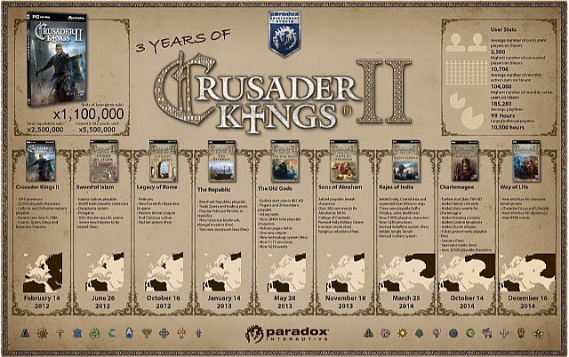 Gra strategiczna Crusader Kings II: Mroczne Wieki zadebiutowała na komputerach osobistych 14 lutego 2012 roku. Po trzech latach obecności produkcji na rynku, firma Paradox Interactive postanowiła podsumować dokonania tytułu. W związku z tym opublikowano poniższą infografikę, z której wynika, że projekt sprzedał się w nakładzie przekraczającym 1,1 mln egzemplarzy, dodatki rozeszły się w 2,5 mln egzemplarzy, a pomniejsze DLC mogą się pochwalić wynikiem na poziomie 5,5 mln sprzedanych sztuk. Oznacza to, że z pozoru niszowa produkcja ma całkiem spore grono oddanych fanów, co zresztą potwierdzają dalsze informacje.