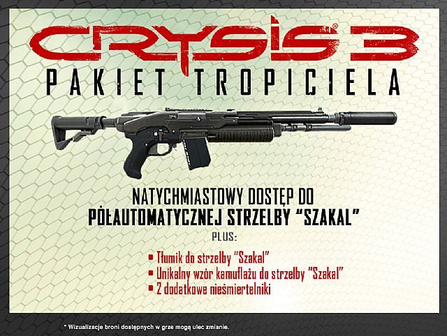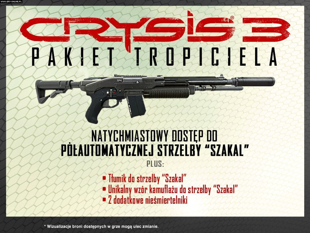 Przygotowano także specjalny bonus dla wszystkich zamawiających grę przedpremierowo. Oprócz obiecywanej wcześniej cyfrowej wersji pierwszej części Crysis, wszystkie zakupy dokonane przed końcem beta-testów (a więc przed 12 lutego) zostaną wzbogacone o pakiet tropiciela. Zawierać będzie on półautomatyczną strzelbę szakal wyposażoną w tłumik, kamuflaż do niej, a także dwa unikalne nieśmiertelniki. Wymienione elementy służyć będą rozgrywce w trybie wieloosobowym. Promocją objęci zostaną wszyscy dotychczasowi jak i przyszli nabywcy Crysis 3.
