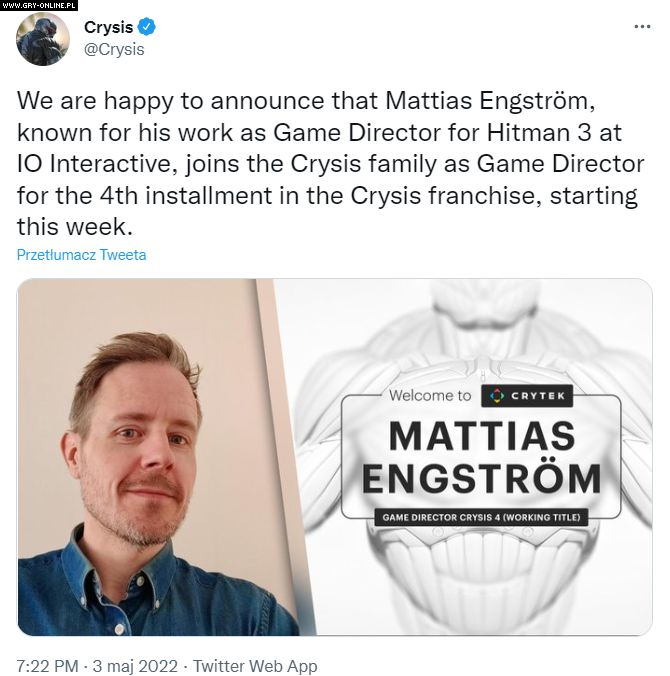 Studio Crytek ogłosiło nazwisko reżysera Crysisa 4. Jest nim Mattias Engström, który wyreżyserował m.in. Hitmana 3 z 2021 roku.