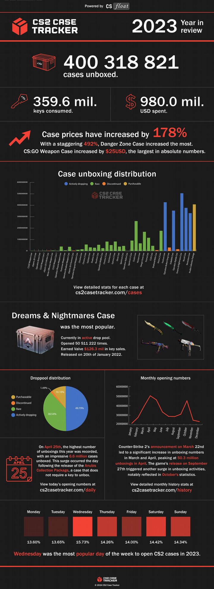 Serwis przedstawił też garść innych danych, pokazujących popularność poszczególnych serii oraz okresy szczególnie intensywnego otwierania skrzyń przez graczy. Najwięcej rozpakowano ich 25 kwietnia (6,6 mln), co miało być efektem pojawienia się Kolekcji Anubisa, ale też oficjalnej zapowiedzi Counter-Strike’a 2 w dniu 22 marca.
