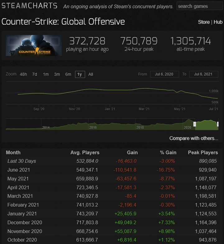 Jednak liczby mówią same za siebie – średnia liczba graczy w maju wyniosła 659 888, a w czerwcu było ich już jedynie 549 347. Nie są to pocieszające wyniki dla Valve, tym bardziej, że Valorant z każdym miesiącem zdaje się rosnąć w siłę. Włodarze Steama będą musieli się postarać, żeby znowu przyciągnąć do siebie odbiorców. Częścią tego planu może być zmiana silnika gry, o czym niedawno krążyły pogłoski.