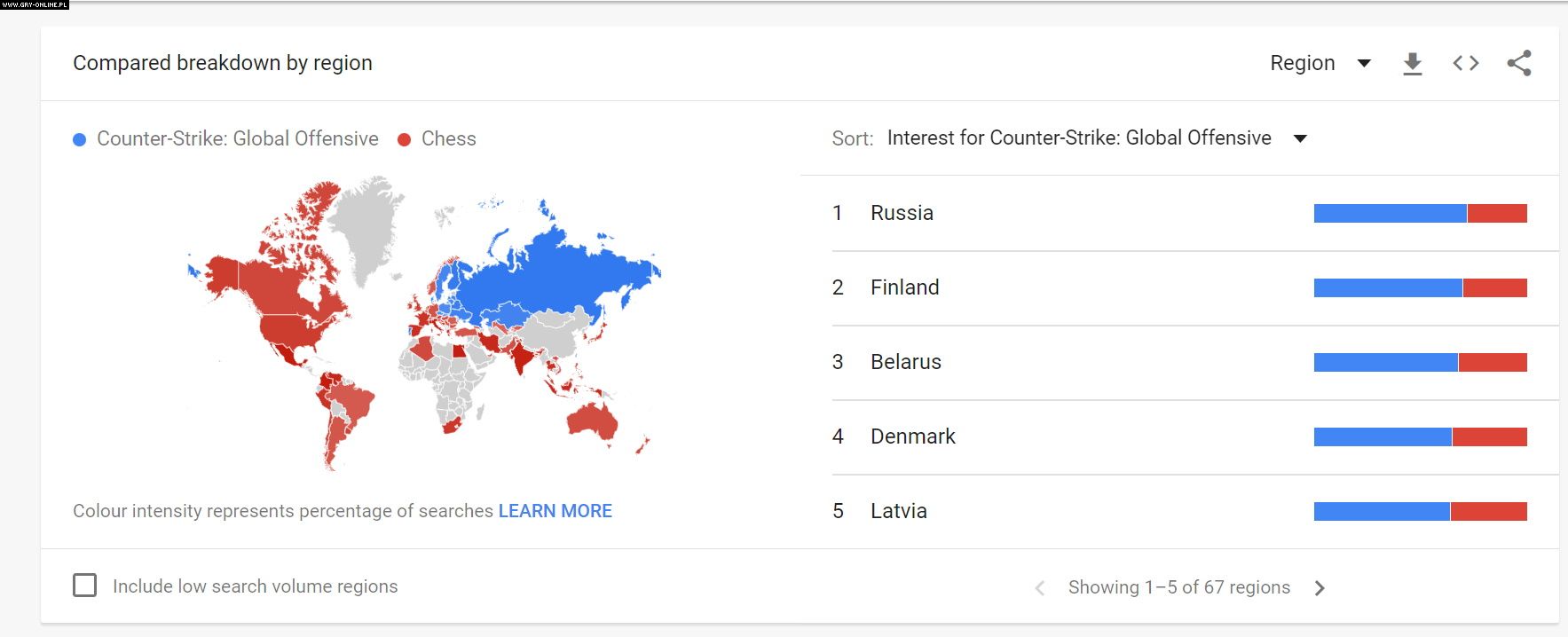 Lista państw, w których przepaść między wyszukiwaniem tematu CSGO a szachami jest największa wciąż się zmienia. Wśród nich zawsze pojawia się jednak Rosja, co może być sporym zaskoczeniem zważywszy na fakt, iż rosyjscy gracze szachowi przez długi czas utrzymywali się na listach niekwestionowanych mistrzów świata w tej dyscyplinie. Z drugiej strony Counter Strike rzeczywiście kojarzy się wielu osobom z Rosjanami i ich wulgaryzmami.