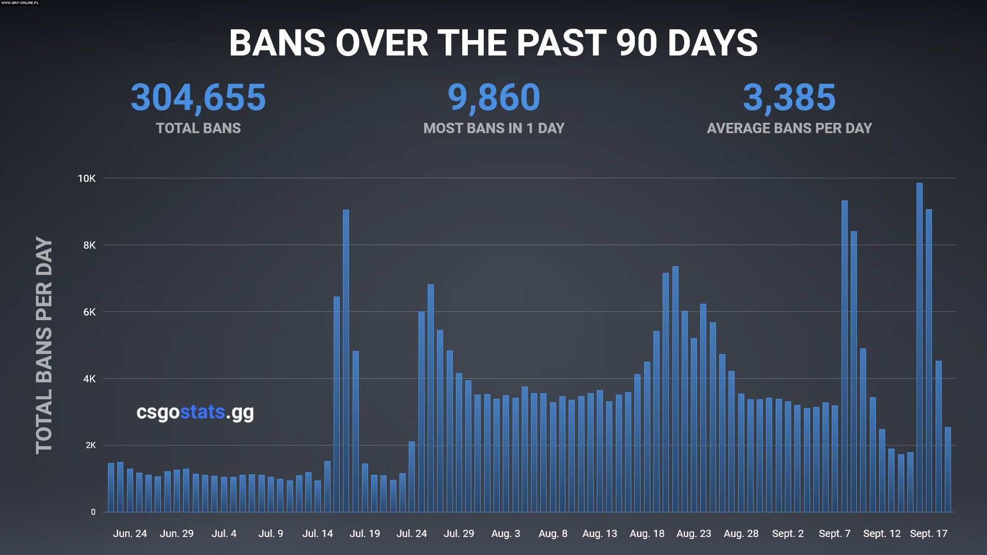 Na Twitterze CS:GO Stats pojawiła się grafika ilustrująca skalę zjawisk w ostatnim czasie. Od 16 lipca średnia liczba banów wzrosła ponad dwukrotnie. Miesięcznie bany dostaje średnio ponad 100 000 uzytkowników. Dla porównania w poprzednim roku ta liczba wynosiła około 80 000.