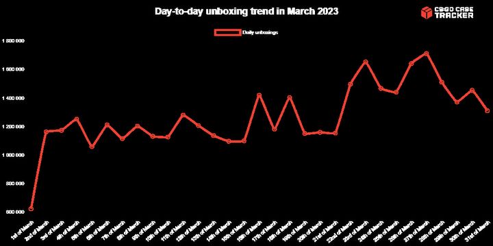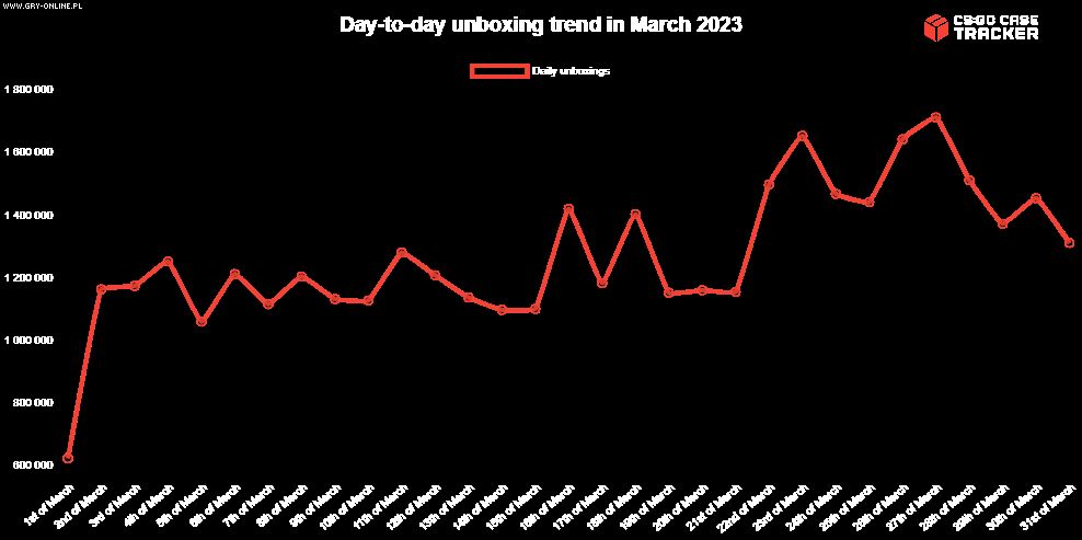 Jak można się domyślić, największy ruch na kosmetycznym rynku CSGO zanotowano w tygodniu, w którym Valve ogłosiło start bety CS 2. Rekordowym dniem w tym miesiącu okazał się 27 marca, kiedy to dokonano ponad 1 mln 713 tys. transakcji.