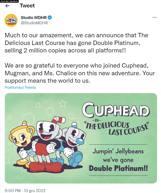 Dodatek, który powstawał w bólach (proces produkcji trwał aż pięć lat), zebrał doskonałe oceny, a niespełna kilka tygodni po premierze został zakupiony przez ponad milion graczy. Wczoraj wieczorem studio MDHR postanowiło pochwalić się zaktualizowanymi wynikami sprzedaży.