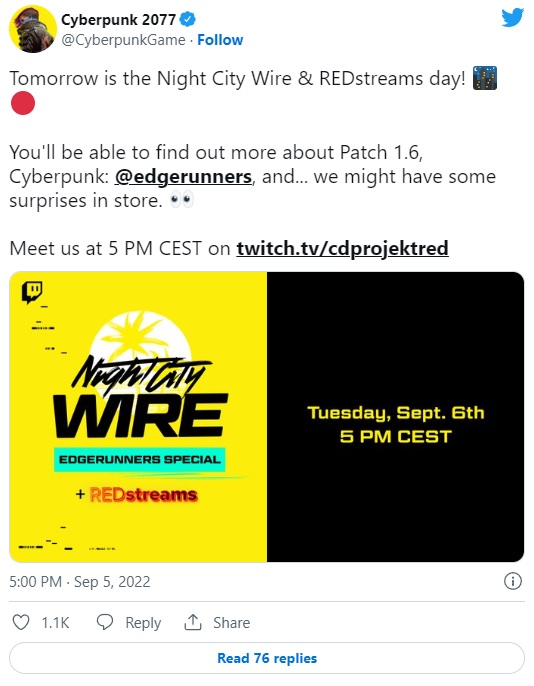 Na koncie Instagram poświęconym Cyberpunk 2077 pojawiło się więcej szczegółów na temat ogłoszeń, jakich można się spodziewać podczas jutrzejszego REDstreams. Jak czytamy: „będziemy rozmawiać z Milesem Tostem i Patrickiem Millsem o wszystkich nowych rzeczach, które pojawią się w Cyberpunk 2077 wraz z kolejną aktualizacją – w tym o nowej zawartości i misjach inspirowanych @edgerunners, nowych broniach i nowych funkcjach!”.