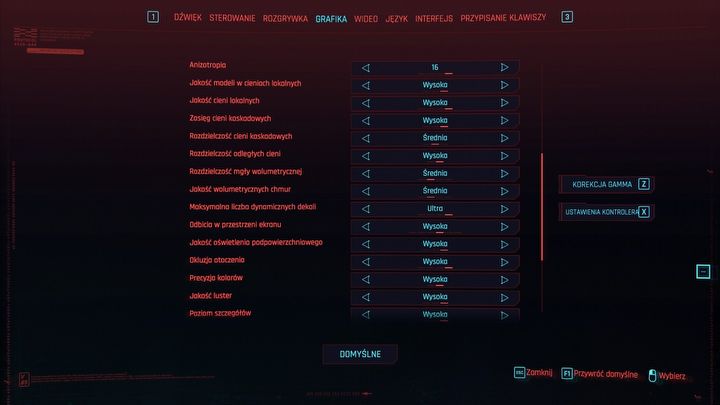Najbardziej obciążającymi kartę graficzną ustawieniami są: rozdzielczość cieni kaskadowych (zalecamy średni poziom) i mgły wolumetrycznej (zalecamy obniżenie do średniego), jakość wolumetrycznych chmur (tu można rozważyć nawet wyłączenie) oraz w szczególności odbicia w przestrzeni ekranu (polecamy zmniejszyć przynajmniej do wysokiego albo niskiego w przypadku słabszego GPU). Reszta ustawień też ma wpływ na płynność animacji, ale poza może jeszcze rzadko występującymi lustrami czy okluzją otoczenia dopiero zmniejszenie kilku naraz może zaprocentować, tylko wtedy niestety wyraźnym kosztem jakości grafiki.