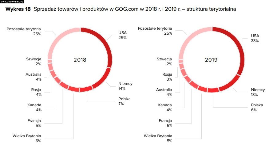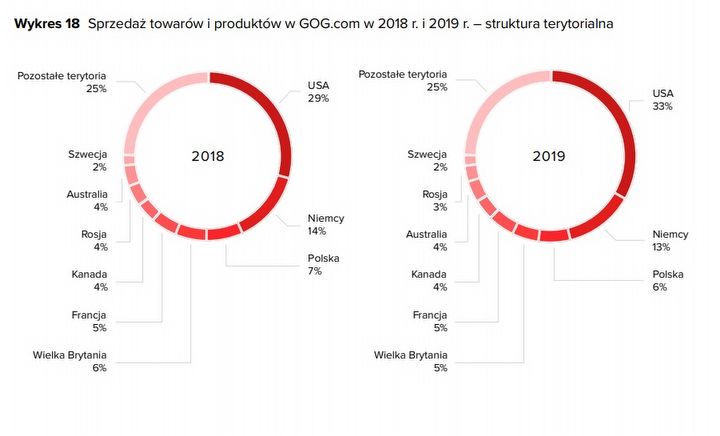 Prócz tego firma porównała też rozkład terytorialny sprzedaży w ostatnich dwóch latach. Największym rynkiem dla platformy wciąż była Ameryka Północna, przede wszystkim USA (33%). Na drugim miejscu znalazły się Niemcy (13%), a na trzecim polscy gracze, którzy stanowili 6% nabywców w 2019 roku.