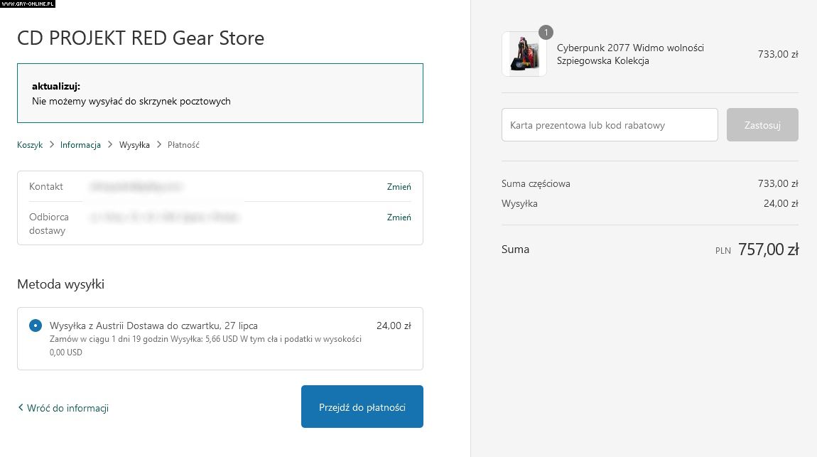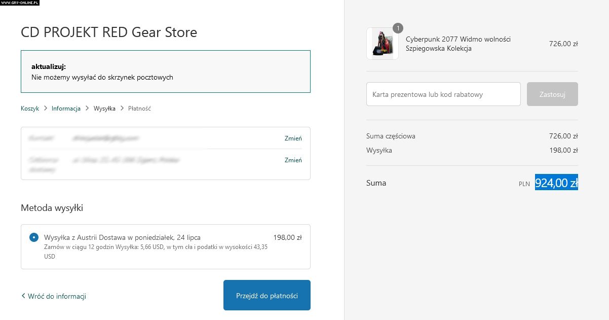 Wygląda na to, że CD Projekt wraz z operatorem sklepu naprawili sytuację z horrendalnie drogą wysyłką. Aktualnie przy składaniu zamówienia na opisaną niżej kolekcję sytuacja prezentuje się następująco: